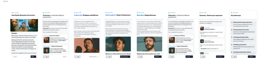 The Problem: Standard workplace harassment training often fails because it is too theoretical and policy-focused. Users view it as a mandatory chore rather than a tool for cultural change. These static lessons don’t prepare employees for the emotional complexity or the rapid-fire judgment needed to respond to harassment in real-time.